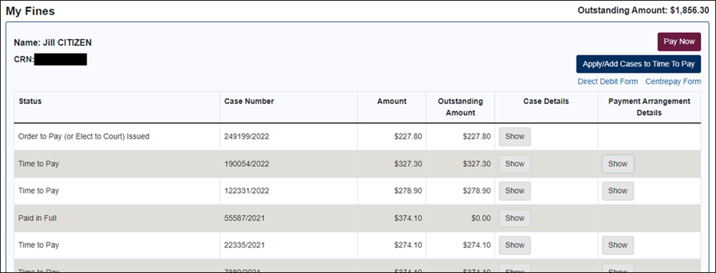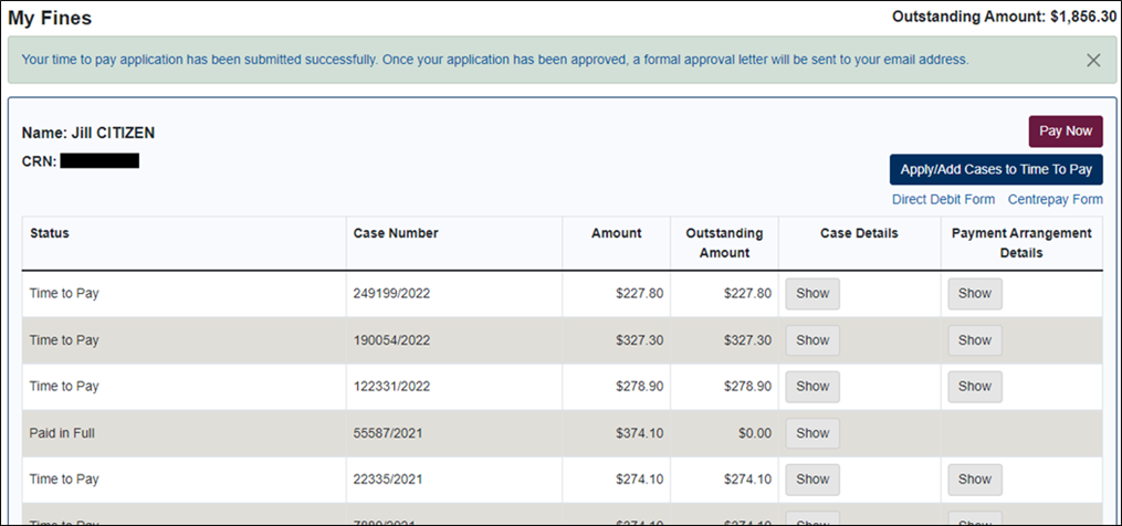 NOTE: Click the Show button in the Payment Arrangement Details column against a fine/infringement to see the details of the next time to pay arrangement.